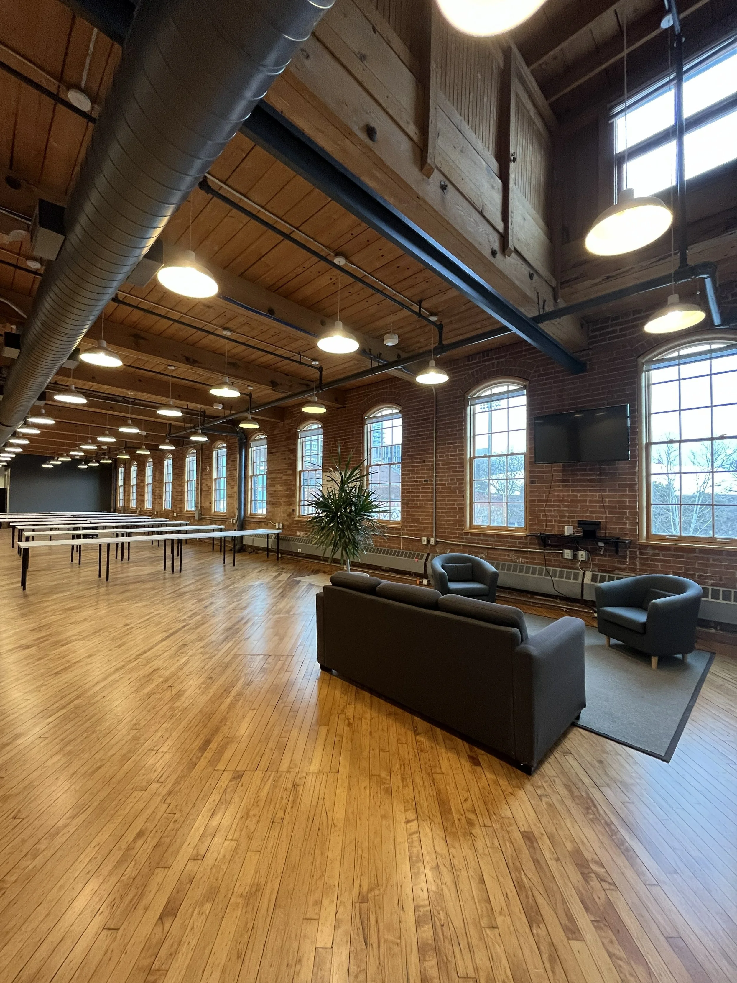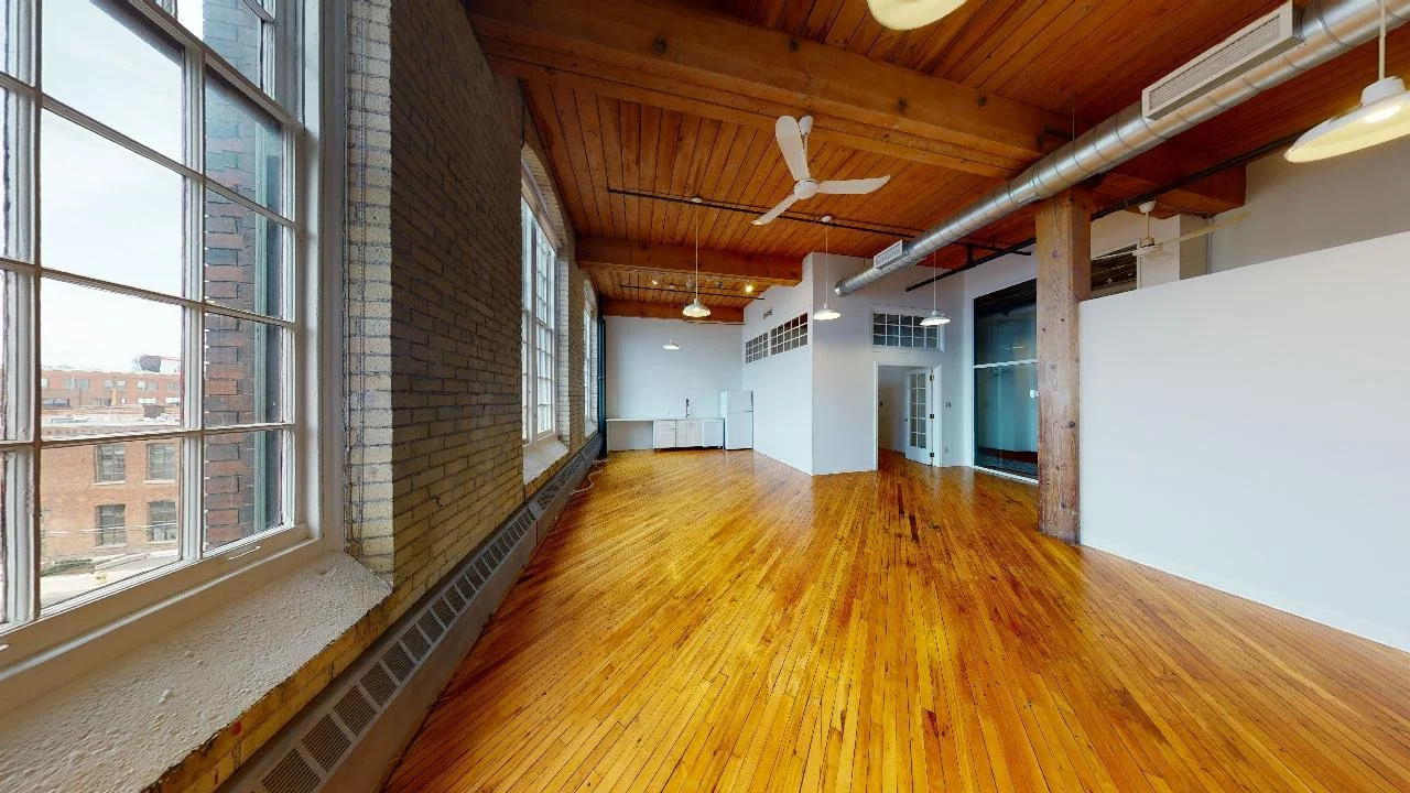 Features A combination of adjacent brick and beam suites on the 4th floor looking West. 18.5’ ceilings, operable windows. Meeting rooms and kitchenette under mezzanine