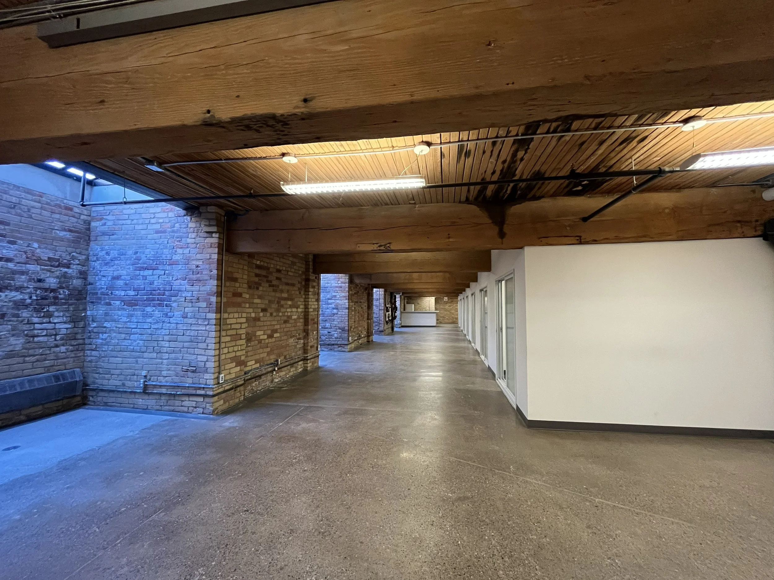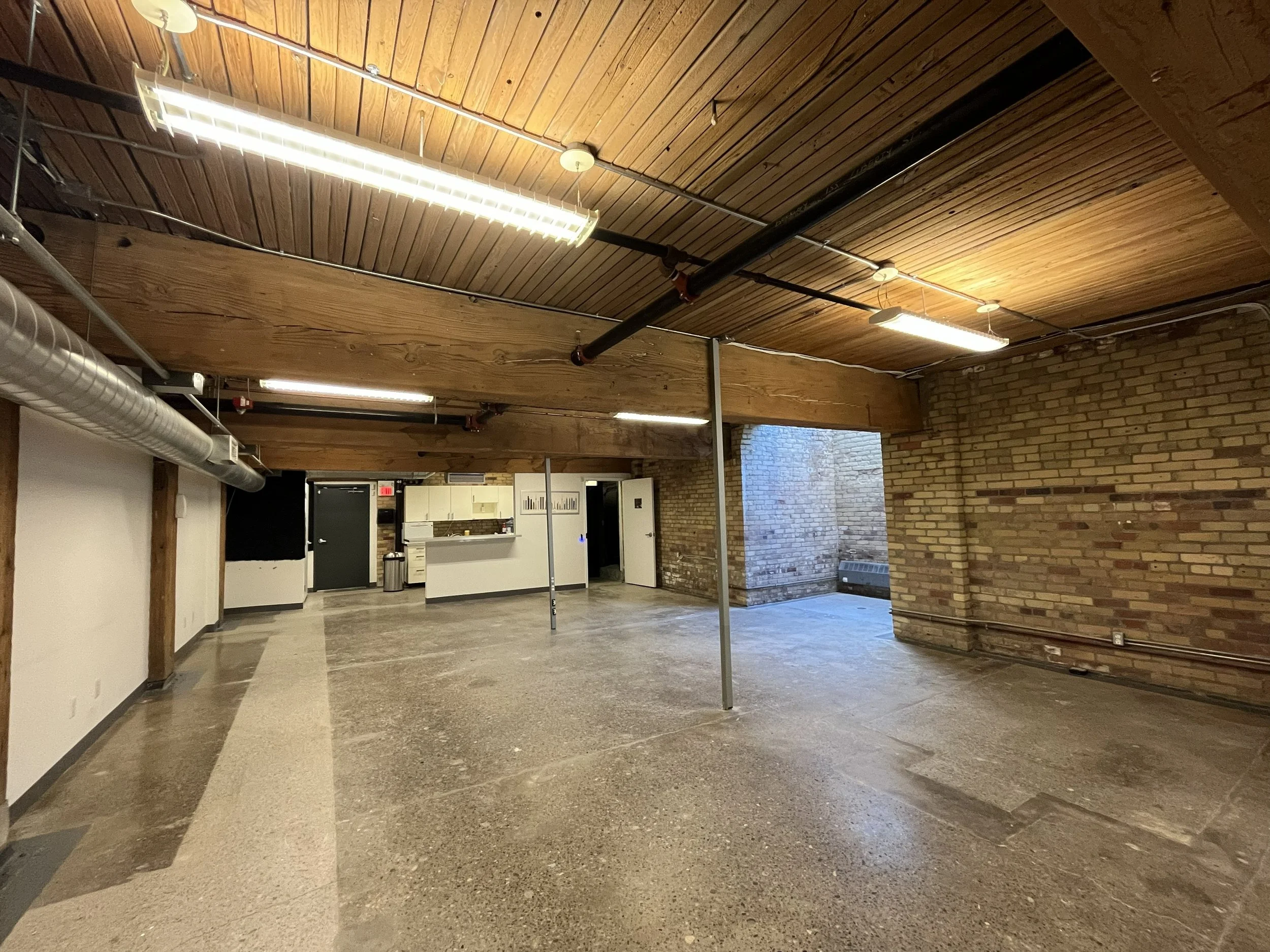 Features 3 private offices, meeting room, storage and washrooms in bright brick and beam suite with newly polished concrete floors, fresh paint and new lights. Large open area, kitchen roughed in.