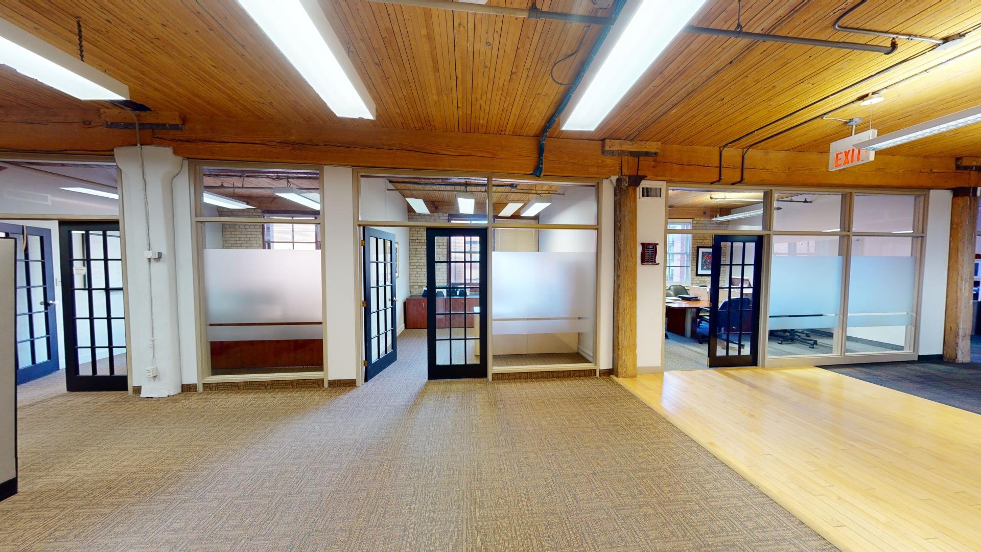 Features Numerous window wells make for a bright lower level suite. Combo of offices/edit suites and open area in classic brick and beam space. Polished floors.