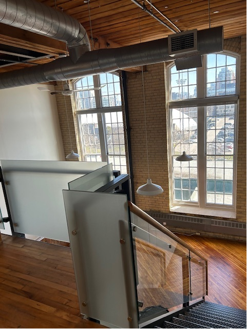 Features Multiple private offices on glass under mezzanine, kitchen, storage, mezzanine. Hardwood floors. 18.5’ ceilings. West view.